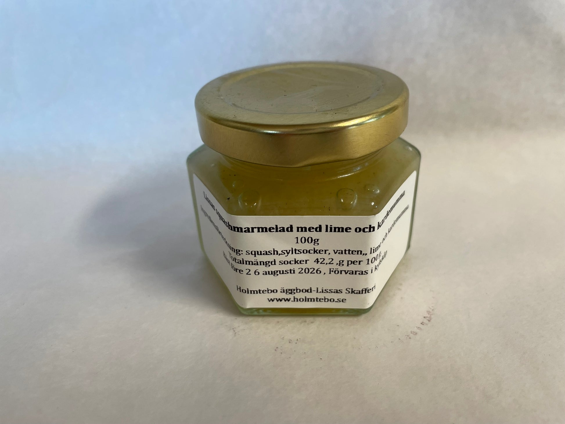 Ingrediensförteckning: Squash, Vatten, Syltsocker, Lime, Kardemumma